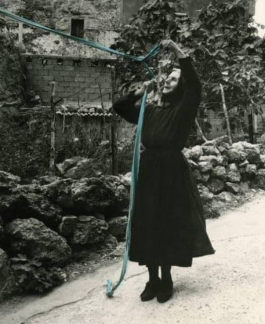 Legarsi alla Montagna (Bound to the Mountain) which took place over 3 days beginning on September 8th, 1981. Harkening back to a Sardinian legend of a young girl saved from death by chasing a blue ribbon out of a cave, the artist convinced the residents of Ulassai to tie their homes and the mountain together with 17 miles of blue ribbon. A symbolic act of communal unity, the process was tempered by personal conflicts and ancient family feuds, resulting in ribbon that was knotted (for friendship), wrapped tightly (for conflict), or hung with bread (for love). This combination of land art, performance art, and sculpture was captured at the time by renowned photographer Piero Berengo Gardin, in images that the artist has worked with watercolors and markers. Art historian Elena Pontiggia has contributed the text.