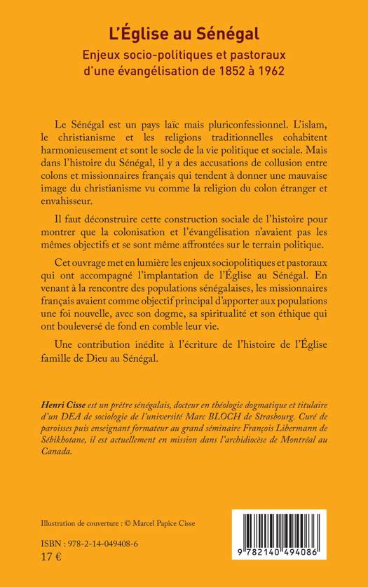 Le Sénégal est un pays laïc mais pluriconfessionnel. L'islam, le christianisme et les religions traditionnelles cohabitent harmonieusement et sont le socle de la vie politique et sociale. Mais dans l'histoire du Sénégal, il y a des accusations de collusion entre colons et missionnaires français qui tendent à donner une mauvaise image du christianisme vu comme la religion du colon étranger et envahisseur. Il faut déconstruire cette construction sociale de l'histoire pour montrer que la colonisation et l'évangélisation n'avaient pas les mêmes objectifs et se sont même affrontées sur le terrain politique. Cet ouvrage met en lumière les enjeux sociopolitiques et pastoraux qui ont accompagné l'implantation de l'Église au Sénégal.