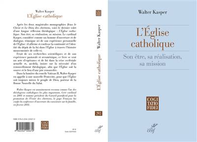 Après les deux magistrales monographies Jésus le Christ" et "Le Dieu des chrétiens", voici le dernier volet d'une longue réflexion théologique : "L'Église catholique. Son être, sa réalisation, sa mission". Le cardinal Kasper, considéré comme un homme d'ouverture et de dialogue, témoigne ici de son expérience personnelle de l'Église : il affirme et confesse la continuité et l'identité du dépôt de la foi dans l'Église à travers l'histoire mouvementée de celle-ci. Fruit de ses recherches scientifiques et de son expérience pastorale et oecuménique, ce livre se veut un acte d'espérance et de foi dans la crise ecclésiale actuelle et, au-delà, insiste sur la nécessité d'un renouvellement théologique, afin que l'Église soit la source et le lieu d'une joie renouvelée. Dans la lumière du concile Vatican II, Walter Kasper en appelle à une nouvelle Pentecôte, pour que l'Église soit toujours mieux le peuple de Dieu, porteur de la Bonne Nouvelle du Salut."