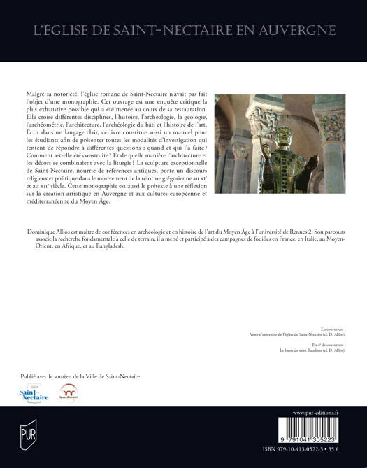 Malgré sa notoriété, l’église romane de Saint-Nectaire n’avait pas fait l’objet d’une monographie. Cet ouvrage est une enquête critique la plus exhaustive possible qui a été menée au cours de sa restauration. Elle croise différentes disciplines, l’histoire, l’archéologie, la géologie, l’archéométrie, l’architecture, l’archéologie du bâti et l’histoire de l’art. Écrit dans un langage clair, ce livre constitue aussi un manuel pour les étudiants a n de présenter toutes les modalités d’investigation qui tentent de répondre à différentes questions : quand et qui l’a faite ? Comment a-t-elle été construite ? Et de quelle manière l’architecture et les décors se combinaient avec la liturgie ? La sculpture exceptionnelle de Saint-Nectaire, nourrie de références antiques, porte un discours religieux et politique dans le mouvement de la réforme grégorienne au XIe et au XIIe siècle. Cette monographie est aussi le prétexte à une réflexion sur la création artistique en Auvergne et aux cultures européenne et méditerranéenne du Moyen Âge.