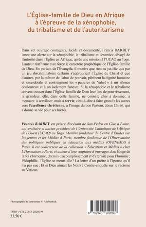L'auteur lance une alerte sur la xénophobie, le tribalisme et l'exercice dévoyé de l'autorité dans l'Église en Afrique. Il réaffirme avec force le caractère prophétique de l'Église-famille de Dieu. En partant de l'Évangile, il montre que rien ne justifie que par un jeu discriminatoire certains s'approprient l'Église du Christ et que d'autres, par la culture de l'abus de pouvoir, piétinent la dignité humaine et sacerdotale et contraignent les « pauvres de Yahvé » à un silence douloureux et à un isolement funeste.