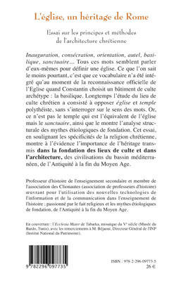 Cet essai, en soulignant les spécificités de la religion chrétienne, montre à l'évidence l'importance de l'héritage transmis dans la fondation des lieux de culte et dans l'architecture, des civilisations du bassin méditerranéen, de l'Antiquité à la fin du Moyen Age.