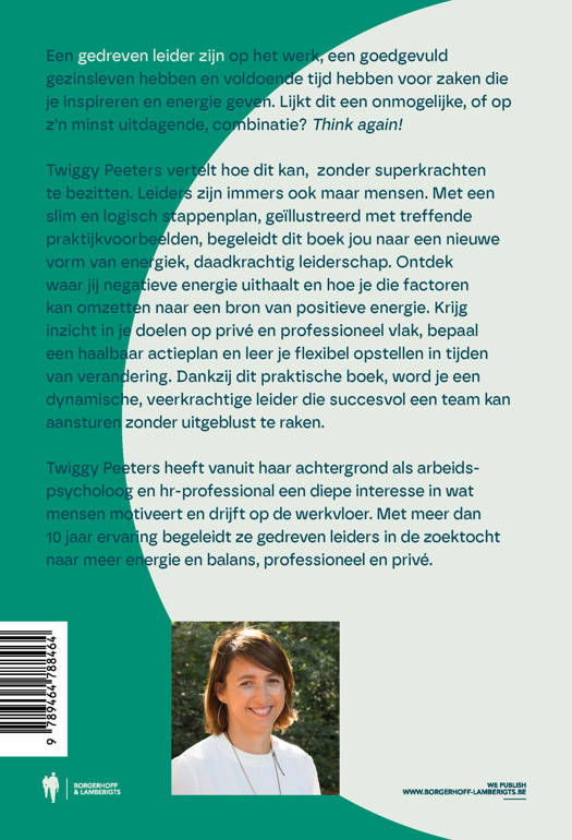 Een gedreven leider zijn op het werk, een goedgevuld gezinsleven hebben en voldoende tijd hebben voor zaken die je inspireren en energie geven. Lijkt dit een onmogelijke, of op z’n minst uitdagende, combinatie? Think again! In ‘Leiden zonder lijden’ bewijst energy coach Twiggy Peeters dat dit mogelijk is, zonder superkrachten te bezitten. Leiders zijn immers ook maar mensen. Met een slim en logisch stappenplan, geïllustreerd met treffende praktijkvoorbeelden, begeleidt de auteur jou naar een nieuwe vorm van energiek, daadkrachtig leiderschap. Ontdek waar jij negatieve energie uithaalt en hoe je die factoren kan omzetten naar een bron van positieve energie. Krijg inzicht in je doelen op privé en professioneel vlak, bepaal een haalbaar actieplan en leer je flexibel opstellen in tijden van verandering. Dankzij dit praktische boek, boordevol haalbare handvaten word je een dynamische, veerkrachtige leider die succesvol een team kan aansturen zonder uitgeblust te raken.