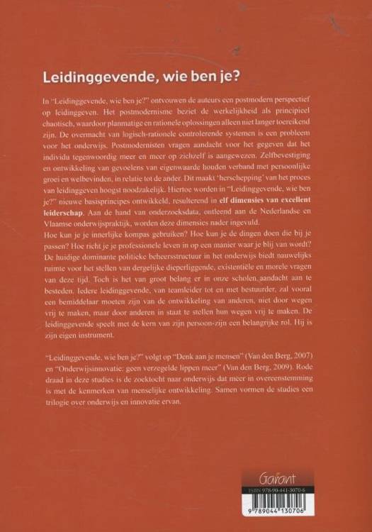 In "Leidinggevende, wie ben je?" ontvouwen de auteurs een postmodern perspectief op leidinggeven. Het postmodernisme beziet de werkelijkheid als principieel chaotisch, waardoor planmatige en rationele oplossingen alleen niet langer toereikend zijn. De overmacht van logisch-rationele controlerende systemen is een probleem voor het onderwijs. Postmodernisten vragen aandacht voor het gegeven dat het individu tegenwoordig meer en meer op zichzelf is aangewezen. Zelfbevestiging en ontwikkeling van gevoelens van eigenwaarde houden verband met persoonlijke groei en welbevinden, in relatie tot de ander. Dit maakt 'herschepping' van het proces van leidinggeven hoogst noodzakelijk. Hiertoe worden in "Leidinggevende, wie ben je?" nieuwe basisprincipes ontwikkeld, resulterend in elf dimensies van excellent leiderschap. Aan de hand van onderzoeksdata, ontleend aan de Nederlandse en Vlaamse onderwijspraktijk, worden deze dimensies nader ingevuld.