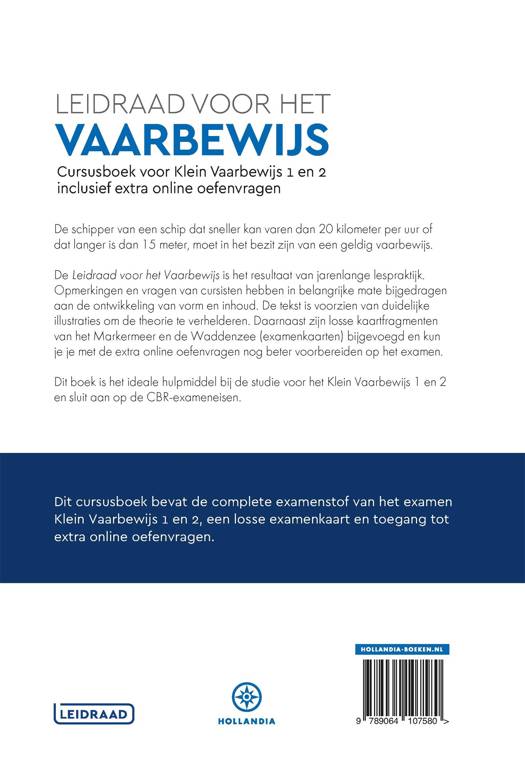 Dit cursusboek bevat de complete examenstof van het examen Klein Vaarbewijs 1 (KVB1) en 2 (KVB2). De 'Leidraad voor het Vaarbewijs' is het resultaat van jarenlange lespraktijk. Opmerkingen en vragen van cursisten hebben in belangrijke mate bijgedragen aan de ontwikkeling van vorm en inhoud. De tekst is voorzien van duidelijke illustraties om de theorie te verhelderen. Daarnaast zijn losse kaartfragmenten van het Markermeer en de Waddenzee (examenkaarten) bijgevoegd en kun je je met de extra online oefenvragen nog beter voorbereiden op het examen. Zo haal je binnen een mum van tijd je vaarbewijs. Dit boek is daarom het ideale hulpmiddel bij de studie voor het Klein Vaarbewijs 1 en 2 en sluit aan op de CBR- exameneisen.