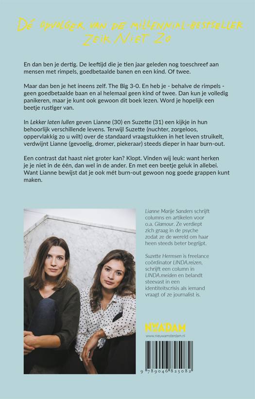 Nou, lekker laten lullen, zeggen Suzette Hermsen (1987) en Lianne Marije Sanders (1988). Ze doen heus pogingen zich verantwoordelijk te gedragen (afval scheiden) of zichzelf te vinden (Lianne las alle zelfhulpboeken van bol.com in een poging haar burn-out te boven te komen), maar bovenal doen ze maar wat. Zonder vijfjarenplan. Maar met een fles pinot grigio. Want gris, dat kende Suzette tot deze aanbiedingstekst niet eens.