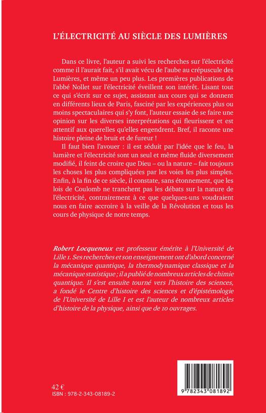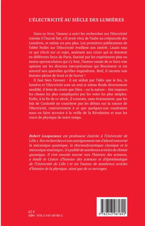 Dans ce livre, l'auteur a suivi les recherches sur l'électricité comme il l'aurait fait, s'il avait vécu de l'aube au crépuscule des Lumières. Les premières publications de l'abbé Nollet sur l'électricité éveillent son intérêt. Lisant tout ce qui s'écrit sur ce sujet, assistant aux cours qui se donnent en différents lieux de Paris, l'auteur essaie de se faire une opinion sur les diverses interprétations qui fleurissent et est attentif aux querelles qu'elles engendrent