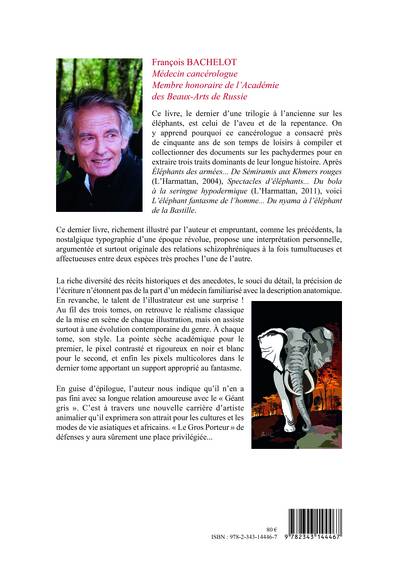 Après "Eléphants des armées" (Harmattan, 2004), "Spectacles d'éléphants" (Harmattan, ouvrage en couleur, 2011), voici le dernier livre d'une trilogie sur les éléphants. Richement illustré par l'auteur, cet ouvrage propose une interprétation personnelle, argumentée et surtout originale des relations schizophréniques à la fois tumultueuses et affectueuses entre l'éléphant et l'homme, deux espèces très proches l'une de l'autre.