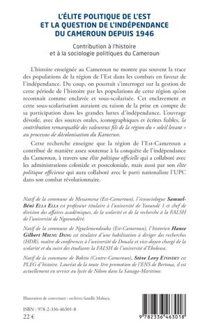 L'histoire enseignée au Cameroun ne montre pas souvent la trace des populations de la région de l'Est dans les combats en faveur de l'indépendance. Du coup, on pourrait s'interroger sur la gestion de cette période de l'histoire par les populations de cette région qu'on reconnait comme enclavée et sous-scolarisée. Cet enclavement et cette sous-scolarisation auraient eu raison de la prise en compte de sa participation dans les grandes luttes d'indépendance. L'ouvrage dévoile, avec des sources orales, iconographiques et écrites fiables, la contribution remarquable des valeureux fils de la région du soleil levant au processus de décolonisation du Kamerun. Cette recherche enseigne que la région de l'Est-Cameroun a contribué de manière assez soutenue à la conquête de l'indépendance du Cameroun, à travers une élite politique officielle qui a collaboré avec les administrations coloniale et postcoloniale, mais aussi par son élite politique officieuse qui aura collaboré avec le parti nationaliste l'UPC dans son combat révolutionnaire.