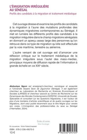 Cet ouvrage dresse et examine les profils de candidats à la migration à l’aune des mutations profondes des dynamiques migratoires contemporaines au Sénégal. Il met en lumière les différents profils des candidats à la migration irrégulière dans le champ migratoire sénégalais en donnant un aperçu assez large des personnes qu’on retrouve dans ce type de migration qu’elle soit effectuée par la voie maritime, terrestre ou aérienne. L’autre versant de cet ouvrage est d’amorcer une réflexion critique sur le traitement médiatique de la migration irrégulière sous l’autel des mass-medias, principaux moyens de diffusion rapide de l’information à grande échelle en ce XXIe siècle.