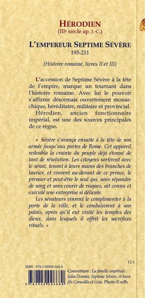 « Sévère s'avança ensuite à la tête de son armée jusqu'aux portes de Rome. Cet appareil redoubla la crainte du peuple déjà étonné de tant de résolution. Les citoyens sortirent avec le sénat, tenant à leurs mains des branches de laurier, et vinrent au-devant de ce prince, le premier et peut-être le seul qui, sans répandre de sang et sans courir de risques, ait connu et exécuté une entreprise si délicate.