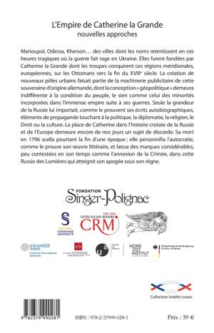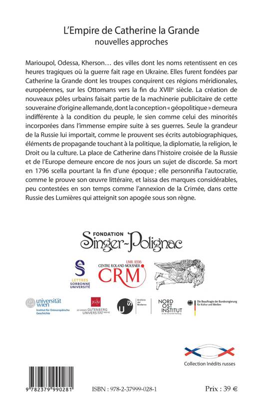 Marioupol, Odessa, Kherson des villes dont les noms retentissent en ces heures tragiques où la guerre fait rage en Ukraine. Elles furent fondées par Catherine la Grande dont les troupes conquirent ces régions méridionales, européennes, sur les Ottomans vers la fin du XVIIIe siècle. La création de nouveaux pôles urbains faisait partie de la machinerie publicitaire de cette souveraine d'origine allemande, dont la conception « géopolitique » demeura indifférente à la condition du peuple, le sien comme celui des minorités incorporées dans l'immense empire suite à ses guerres. Seule la grandeur de la Russie lui importait, comme le prouvent ses écrits autobiographiques, éléments de propagande touchant à la politique, la diplomatie, la religion, le Droit ou la culture. La place de Catherine dans l'histoire croisée de la Russie et de l'Europe demeure encore de nos jours un sujet de discorde. Sa mort en 1796 scella pourtant la fin d'une époque ; elle personnifia l'autocratie, comme le prouve son uvre littéraire, et laissa des marques considérables, peu contestées en son temps comme l'annexion de la Crimée, dans cette Russie des Lumières qui atteignit son apogée sous son règne.