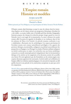 L'Empire romain objet historique occupe le coeur du volume dont les trente-cinq chapitres ont été classés suivant une progression thématique s'étendant du « très visible » au moins visible voire à l'invisible qu'il faut dévoiler. L'épigraphie funéraire propose des champs de recherche presque vierges quand on cesse de l'aborder sous le seul angle de la romanisation. La mise à distance du monde romain offre l'occasion de regarder la discipline et ses tendances dans le but de redonner de l'élan et de l'intérêt à la période romaine confrontée à une « cohabitation » fluctuante avec les archéologues. Les espaces provinciaux de l'occident romain sont comme naturellement privilégiés et les apports des provinces ibériques, incontestables, soulignent un profond renouvellement des perspectives en Espagne et au Portugal. Les études d'histoire militaire indiquent un intérêt continu pour ces sujets. Les recherches sous une forme synthétique consacrées au monde municipal puisent intégralement dans la documentation ibérique et les articles sur les magistrats et les décurions avaient été accueillis avec faveur. On note également que des formulaires ou des notions jugées sans surprise désormais apportent des nouveautés. L'article inédit sur la définition de l'empire reflète les évolutions épistémologiques et la nécessité de répondre au défi qu'elles lancent à une période où la construction européenne ne peut pas servir de comparaison.