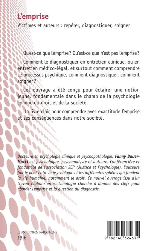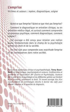 Qu'est-ce que l'emprise ? Qu'est-ce que n'est pas l'emprise ? Comment le diagnostiquer en entretien clinique, ou en entretien me dico-le gal, et surtout comment comprendre ce processus psychique, comment diagnostiquer, comment soigner ? Cet ouvrage a e te conçu pour e clairer une notion jeune, fondamentale dans le champ de la psychologie comme du droit et de la socie te . Un livre clair comprendre avec exactitude l'emprise et ses conséquences dans notre socie te .