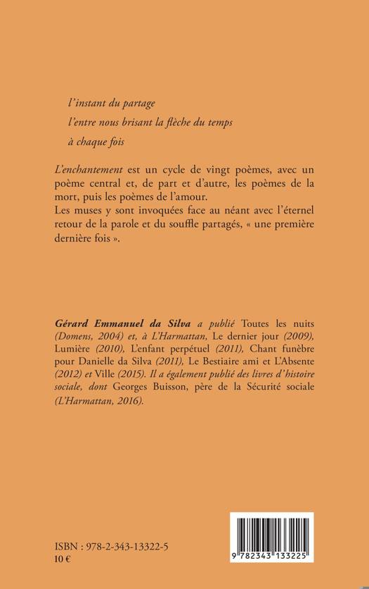 L'instant du partage L'entre nous brisant la flèche du temps à chaque fois L'enchantement est un cyle de vingt poèmes, avec un poème central et, de part et d'autre, les poèmes de la mort, puis les poèmes de l'amour. Les muses y sont invoquées face au néant avec l'éternel retour de la parole et du souffle partagés.
