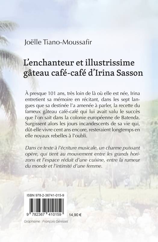 À presque 101 ans, très loin de là où elle est née, Irina entretient sa mémoire en récitant, dans les sept langues que sa destinée l'a amenée à parler, la recette du fameux gâteau café-café qui lui avait valu le succès que l'on sait dans la colonie européenne de Batenda. Surgissent alors les jours incandescents de sa vie qui, dût-elle vivre cent ans encore, resteraient longtemps en elle noyaux rebelles à l'oubli. Dans ce texte à l'écriture musicale, un charme puissant opère, qui tient au mouvement entre les grands horizons et l'espace réduit d'une cuisine, entre la rumeur du monde et l'intimité d'une femme.