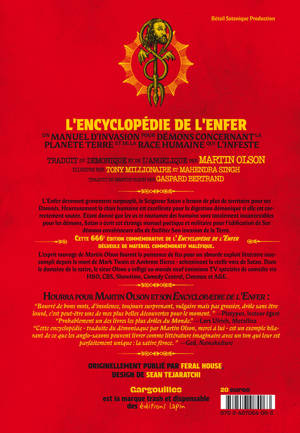 À l'usage des démons de l'Enfer L'Enfer devenant gravement surpeuplé, le Seigneur Satan a besoin de plus de territoire pour ses Damnés. Heureusement, la chair humaine est excellente pour la digestion démonique si elle est correctement sautée. Étant donné que les us et coutumes des humains sont totalement inconcevables pour les démons, Satan a écrit cet étrange manuel poétique et militaire pour l'édification de Ses démons envahisseurs afin de faciliter Son invasion de la Terre. Ce livre inclut de nombreuses illustrations dérangeantes, des diagrammes, des recettes, et un dictionnaire des termes terriens complet quoique tout à fait répugnant. Ce chef d'oeuvre exprime toute la haine de Satan pour l'humanité et pour lui-même et il inclut dans sa partie encyclopédique les techniques pour traquer et manger les humains, les différentes méthodes pour faire des conserves de pus humain et comment découper en tranches ou en dés les orphelins humains