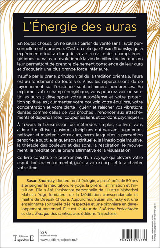 En toutes choses, on ne saurait parler de vérité sans l’avoir personnellement éprouvée. C’est en cela que Susan Shumsky, qui a expérimenté tout au long de sa vie la réalité des champs énergétiques humains, a révolutionné la vie de milliers de lecteurs en leur permettant de prendre pleinement conscience de leur aura et d’acquérir une plus grande force intérieure. Insufflé par le prana, principe vital de la tradition orientale, l’aura est au fondement de toute vie. Ainsi, les répercussions de ce rayonnement sur l’existence sont infiniment nombreuses. En explorant votre champ énergétique, vous pourrez voir ou sentir les auras; développer votre autodéfense et votre protection spirituelles ; augmenter votre pouvoir, votre équilibre, votre concentration et votre clarté ; guérir et relâcher vos vibrations denses comme celles de vos proches ; renoncer aux attachements et dépendances ; couper les liens et cordons psychiques… À travers la transmission de méthodes simples, ce livre vous aidera à maîtriser plusieurs disciplines qui peuvent augmenter, nettoyer et maintenir votre aura, parmi lesquelles la perception sensorielle subtile, la guérison spirituelle, la kinésiologie intuitive, la thérapie des couleurs et des sons, la respiration, le mouvement, la méditation, la prière affirmative et la visualisation. Ce livre constitue le premier pas d’un voyage qui élèvera votre esprit, libérera votre mental, guérira votre corps et fera chanter votre âme.