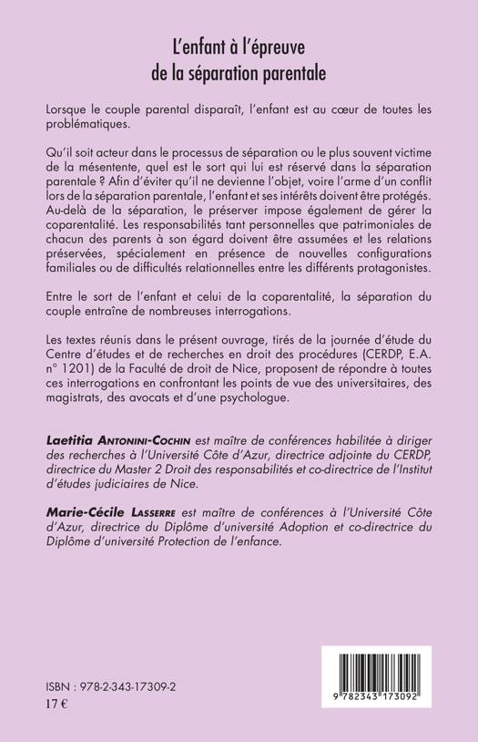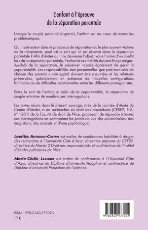 Lorsque le couple parental disparaît, l'enfant est au coeur de toutes les problématiques. Qu'il soit acteur dans le processus de séparation ou le plus souvent victime de la mésentente, quel est le sort qui lui est réservé dans la séparation parentale ? Afin d'éviter qu'il ne devienne l'objet, voire l'arme d'un conflit, l'enfant et ses intérêts doivent être protégés. Au-delà de la séparation, le préserver impose également de gérer la coparentalité. Les responsabilités tant personnelles que patrimoniales de chacun des parents à son égard doivent être assumées et les relations préservées. Entre le sort de l'enfant et celui de la coparentalité, la séparation du couple entraîne de nombreuses interrogations.
