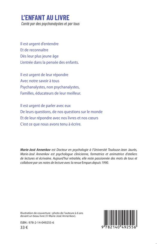 Il est urgent d'entendre Et de reconnaître Dès leur plus jeune âge L'entrée dans la pensée des enfants. Il est urgent de leur répondre Avec notre savoir à tous Psychanalystes, non psychanalystes, Familles, éducateurs de leur meilleur. Il est urgent de parler avec eux De leurs questions, de nos questions sur le monde Et de leur répondre avec nos livres et nos coeurs C'est ce que nous avons tenu à écrire.