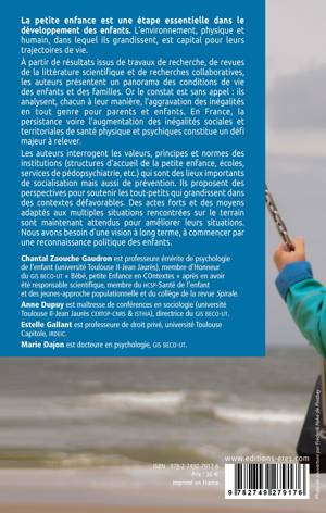 À partir de résultats issus de travaux de recherche, de revues de la littérature scientifique et de recherches collaboratives, les auteurs alertent sur les dégradations des conditions de vie des enfants et des familles et sur les détériorations de plusieurs instances publiques extrafamiliales qui compromettent le développement des tout-petits. Ils analysent les parentalités entre individualisation et résistances, les enjeux et les défis de la socialisation extrafamiliale, les vulnérabilités et les inégalités persistantes, dans une perspective interdisciplinaire et internationale. Ils pointent l’importance de considérer la petite enfance comme une étape essentielle dans les trajectoires de vie et donc des contextes dans lesquels grandissent les enfants. Pour les améliorer, il faut développer une vision à long terme, à commencer par une reconnaissance politique des enfants.