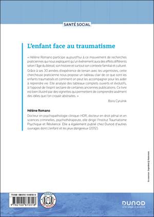 « Hélène Romano participe aujourd’hui à ce mouvement de recherches praticiennes qui nous expliquent qu’un événement aura des effets différents selon l’âge du blessé, selon son histoire et surtout selon son contexte familial et culturel. Grâce à ces 20 années d’expérience de terrain avec les urgentistes, cette chercheuse praticienne nous propose un tableau clair de ce que sont les enfants traumatisés et comment on peut les accompagner pour les aider à reprendre vie. Elle analyse des tableaux complets ouverts, et évolutifs, à l’opposé de l’esprit sectaire de certaines anciennes publications. Et, ce qui ne gâte rien, ce livre est agréable à lire, bien illustré par des vignettes qui permettent de comprendre aisément des idées que l’on croyait abstraites ! » (Boris Cyrulnik)