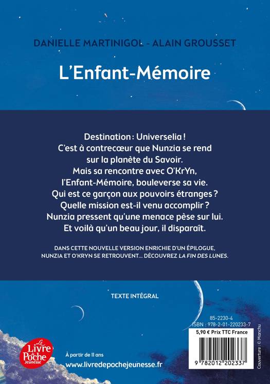 Destination : Universelia ! C'est à contrecœur que Nunzia se rend sur la planète du Savoir. Mais sa rencontre avec O'KrYn, l'Enfant-Mémoire, bouleverse sa vie. Qui est ce garçon aux pouvoirs étranges ? Quelle mission est-il venu accomplir ? Nunzia pressent qu'une menace pèse sur lui. Et voilà qu'un beau jour, il disparaît.