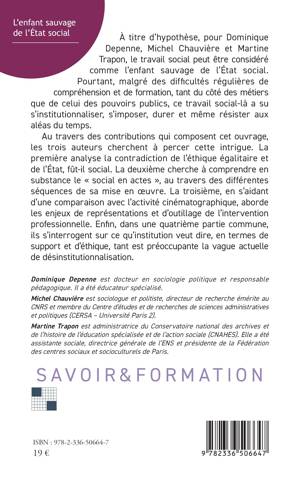 À titre d'hypothèse, pour Dominique Depenne, Michel Chauvière et Martine Trapon, le travail social peut être considéré comme l'enfant sauvage de l'État social. Pourtant, malgré des difficultés régulières de compréhension et de formation, tant du côté des métiers que de celui des pouvoirs publics, ce travail social-là a su s'institutionnaliser, s'imposer, durer et même résister aux aléas du temps. Au travers des contributions qui composent cet ouvrage, les trois auteurs cherchent à percer cette intrigue. La première analyse la contradiction de l'éthique égalitaire et de l'État, fût-il social. La deuxième cherche à comprendre en substance le social en actes, au travers des différentes séquences de sa mise en oeuvre. La troisième, en s'aidant d'une comparaison avec l'activité cinématographique, aborde les enjeux de représentations et d'outillage de l'intervention professionnelle. Enfin, dans une quatrième partie commune, ils s'interrogent sur ce qu'institution veut dire, en termes de support et d'éthique, tant est préoccupante la vague actuelle de désinstitutionnalisation.