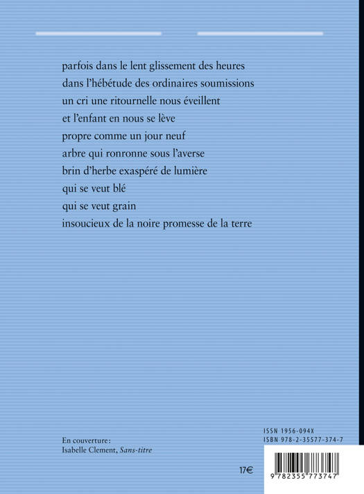 le peu qui reste / la dernière goutte / est encore un océanQUOI ? LE CONTENU. parfois dans le lent glissement des heuresdans l’hébétude des ordinaires soumissionsun cri une ritournelle nous éveillentet l’enfant en nous se lèvepropre comme un jour neufarbre qui ronronne sous l’aversebrin d’herbe exaspéré de lumièrequi se veut bléqui se veut graininsoucieux de la noire promesse de la terreQUI ? L’ AUTEUR. Jean Le Boël, écrivain français, né en 1948. Animateur des Éditions Henry. Fondateur et directeur de publication d’Écrit(s) du Nord. Secrétaire de la Maison de Poésie – Fondation Émile Blémont à Paris. Ont été publiés une dizaine de romans ou récits, deux essais et une autre dizaine de livres de poésie. Il a également contribué à de nombreuses revues ou ouvrages collectifs. Bourse Poncetton de poésie de la SGDL pour Le Paysage immobile en 2009. Prix Mallarmé 2020 pour Jusqu’au jour.