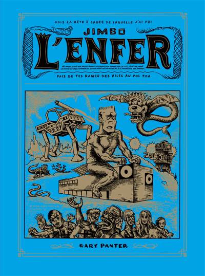 «Jimbo en Enfer» et «Jimbo au Purgatoire» sont considérés comme des oeuvres culte de la BD outre Atlantique. Leur publication en France (regroupée en un volume, tête bèche) s'inscrit dans la lignée d'oeuvres majeures du 9ème art telles que Ivan Brunetti ou Mark Beyer. À la fois passionné de culture underground et d'histoire de l'art, Gary Panter a lu avec délectation la «Divine Comédie» de Dante et en propose une adaptation qui oscille en permanence entre hommage et irrévérence. Son personnage fétiche, Jimbo, un punk un peu simplet coiffé en brosse, se trouve plongé dans cet univers apocalyptique où il chemine avec Valise, son fidèle compagnon de voyage. En chemin, il croise pêle-mêle, des minotaures, des punkettes droguées, des ovnis, des robots géants... Cette atmosphère de perdition illustr