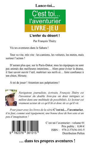 Vis tes aventures dans le Sahara ! Tout va vite, très vite : les camions, les voitures, les motos, mais surtout l’action ! D’autant plus que, sur le Paris-Dakar, tous les équipages ne sont pas animés des meilleures intentionsâ- Alors pour éviter le drame, il faut savoir ouvrir l’Åil, maîtriser ses nerfs et.... faire confiance à ton chien, Hirsute. À toi de jouerâ! Attention aux palpitationsâ!