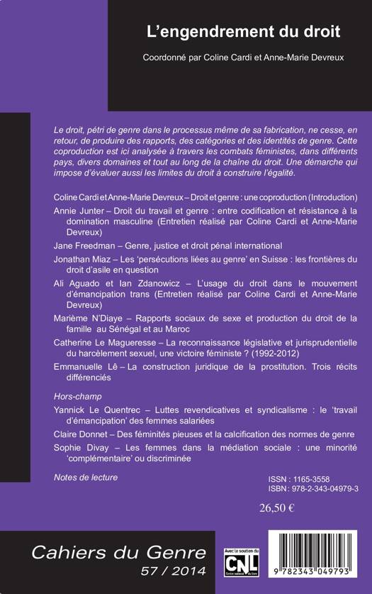 Le droit, pétri de genre dans le processus même de sa fabrication, ne cesse, en retour, de produire des rapports, des catégories et des identités de genre. Cette coproduction est ici analysée à travers les combats féministes, dans différents pays, divers domaines et tout au long de la chaîne du droit. Une démarche qui impose d'évaluer aussi les limites du droit à construire l'égalité.