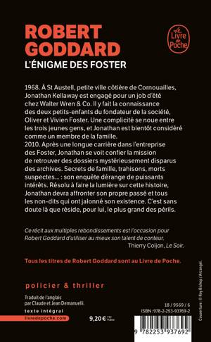 2010. Après une longue carrière dans l’entreprise des Foster, Jonathan se voit confier la mission de retrouver des dossiers mystérieusement disparus des archives. Secrets de famille, trahisons, morts suspectes... : son enquête dérange de puissants intérêts. Résolu à faire la lumière sur cette histoire, Jonathan doit bientôt affronter son propre passé, et tous les non-dits qui ont jalonné son existence. Et c’est sans doute là que réside, pour lui, le plus grand des périls.