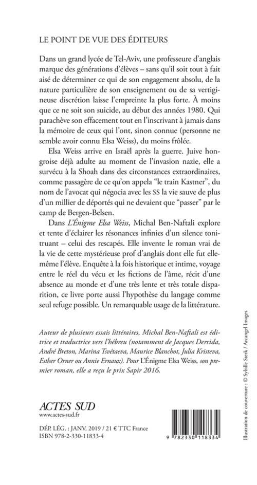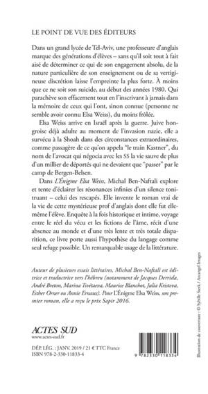 Dans «L'Énigme Elsa Weiss», Michal Ben-Naftali explore et tente d'éclairer les résonances infinies d'un silence tonitruant - celui des rescapés. Elle invente le roman vrai de la vie de cette mystérieuse prof d'anglais dont elle fut elle-même l'élève. Enquête à la fois historique et intime, voyage entre le réel du vécu et les fictions de l'âme, récit d'une absence au monde et d'une très lente et très totale disparition, ce livre porte aussi l'hypothèse du langage comme seul refuge possible. Un remarquable usage de la littérature.