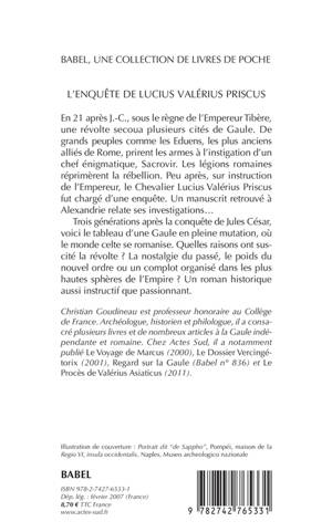 En 21 après J.-C, sous le règne de l'Empereur Tibère, une révolte secoua plusieurs cités de Gaule. De grands peuples comme les Eduens, les plus anciens alliés de Rome, prirent les armes à l'instigation d'un chef énigmatique, Sacrovir. Les légions romaines réprimèrent la rébellion. Peu après, sur instruction de l'Empereur, le Chevalier Lucius Valérius Priscus fut chargé d'une enquête. Un manuscrit retrouvé à Alexandrie relate ses investigations... Trois générations après la conquête de Jules César, voici le tableau d'une Gaule en pleine mutation, où le monde celte se romanise. Quelles raisons ont suscité la révolte ? La nostalgie du passé, le poids du nouvel ordre ou un complot organisé dans les plus hautes sphères de l'Empire ? Un roman historique aussi instructif que passionnant.