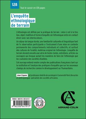 L’ethnologie est définie par la pratique de terrain : celui-ci est à la fois lieu, objet, tradition et forme d'enquête où l'ethnologue entre en contact direct avec ses interlocuteurs. Un séjour de longue durée, une familiarité culturelle et linguistique font de l’« observation participante » l’instrument d'une mise en contexte permanente des comportements individuels et collectifs, et surtout des cultures de l'oralité, matériau originel de l'ethnologie. L'enquête de terrain devient ensuite une série de textes (notes, entretiens, articles ou ouvrages) qui évoque autant les manières de faire de l'ethnologie que les coutumes des sociétés étudiées. Cette 3e édition prend en compte les publications françaises les plus récentes tant sur la restitution et l’analyse des pratiques d’enquête que sur les nouveaux champs de recherche comme le développement ou l’humanitaire.