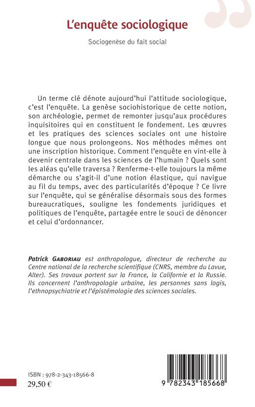 Un terme clé dénote aujourd'hui l'attitude sociologique, c'est l'enquête. La genèse sociohistorique de cette notion, son archéologie, permet de remonter jusqu'aux procédures inquisitoires qui en constituent le fondement. Les uvres et les pratiques des sciences sociales ont une histoire longue que nous prolongeons. Nos méthodes même ont une inscription historique. Comment l'enquête en vint-elle à devenir centrale dans les sciences de l'humain ? Quels sont les aléas qu'elle traversa ? Renferme-t-elle toujours la même démarche ou s'agit-il d'une notion élastique, qui navigue au fil du temps, avec des particularités d'époque ?