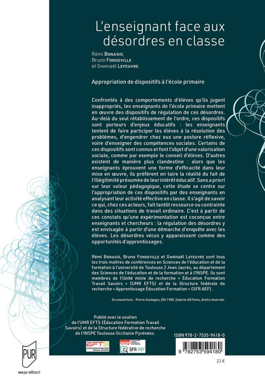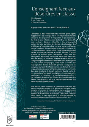 Confrontés à des comportements d’élèves qu’ils jugent inappropriés, les enseignants de l’école primaire mettent en oeuvre des dispositifs de régulation de ces désordres. Au-delà du seul rétablissement de l’ordre, ces dispositifs sont porteurs d’enjeux éducatifs : les enseignants tentent de faire participer les élèves à la résolution des problèmes, d’engendrer chez eux une posture réflexive, voire d’enseigner des compétences sociales.