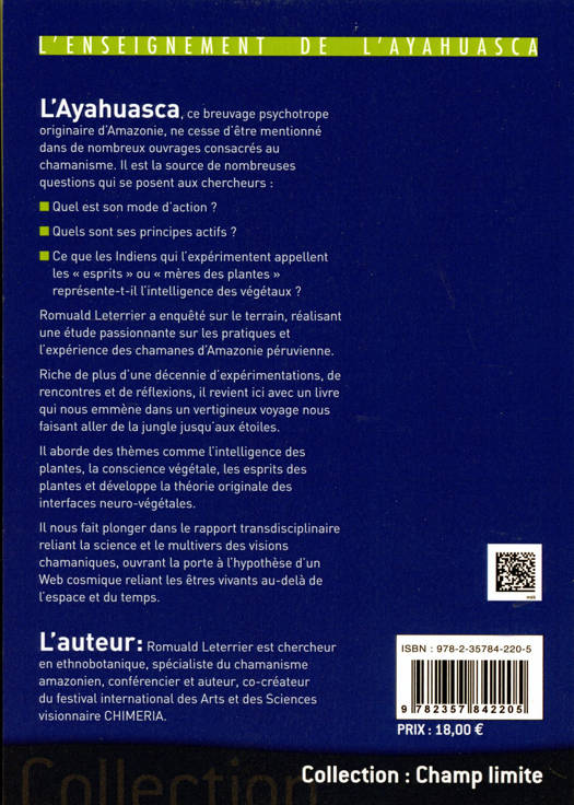 L'Ayahuasca, ce breuvage psychotrope originaire d'Amazonie, ne cesse d'être mentionné dans de nombreux ouvrages consacrés au chamanisme. Il est la source de nombreuses questions qui se posent aux chercheurs : quel est son mode d'action ? Quels sont ses principes actifs ? Ce que les Indiens qui le consomment appellent les « esprits » ou « mères des plantes » représente-t-il l'intelligence des végétaux ? Romuald Leterrier a enquêté sur le terrain, réalisant une étude passionnante sur les pratiques et l'expérience des chamanes d'Amazonie péruvienne. Riche de plus d'une décennie d'expérimentations, de rencontres et de réflexions, il revient ici avec un livre qui nous emmène dans un vertigineux voyage nous faisant aller de la jungle jusqu'aux étoiles. Il aborde des thèmes comme l'intelligence des plantes, la conscience végétale, les esprits des plantes et développe la théorie originale des interfaces neuro-végétales. Il nous fait plonger dans le rapport transdisciplinaire reliant la science et le multivers des visions chamaniques, ouvrant la porte à l'hypothèse d'un Web cosmique reliant les êtres vivants au-delà de l'espace et du temps. Quinze ans après la première édition de ce livre, il nous en propose ici une nouvelle édition enrichie et augmentée.