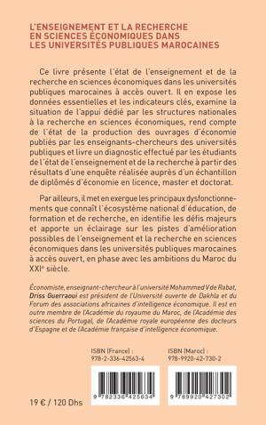 Ce livre présente l’état de l’enseignement et de la recherche en sciences économiques dans les universités publiques marocaines à accès ouvert. Il en expose les données essentielles et les indicateurs clés, examine la situation de l’appui dédié par les structures nationales à la recherche en sciences économiques, rend compte de l’état de la production des ouvrages d’économie publiés par les enseignants-chercheurs des universités publiques et livre un diagnostic effectué par les étudiants de l’état de l’enseignement et de la recherche à partir des résultats d’une enquête réalisée auprès d’un échantillon de diplômés d’économie en licence, master et doctorat. Par ailleurs, il met en exergue les principaux dysfonctionnements que connaît l’écosystème national d’éducation, de formation et de recherche, en identifie les défis majeurs et apporte un éclairage sur les pistes d’amélioration possibles de l’enseignement et la recherche en sciences économiques dans les universités publiques marocaines à accès ouvert, en phase avec les ambitions du Maroc du XXIe siècle.