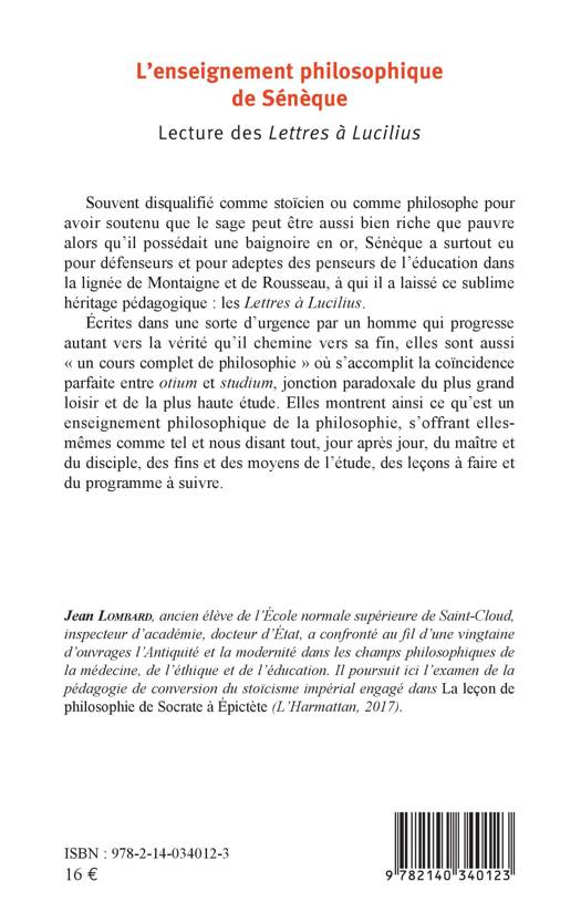 Souvent disqualifié comme stoïcien ou comme philosophe pour avoir soutenu que le sage peut être aussi bien riche que pauvre alors qu'il possédait une baignoire en or, Sénèque a surtout eu pour défenseurs et pour adeptes des penseurs de l'éducation dans la lignée de Montaigne et de Rousseau, à qui il a laissé ce sublime héritage pédagogique: les Lettres à Lucilius. Écrites dans une sorte d'urgence par un homme qui progresse autant vers la vérité qu'il chemine vers sa fin, elles sont aussi un cours complet de philosophie où s'accomplit la coïncidence parfaite entre otium et studium, jonction paradoxale du plus grand loisir et de la plus haute étude. Elles montrent ainsi ce qu'est un enseignement philosophique de la philosophie, s'offrant elles-mêmes comme tel et nous disant tout, jour après jour, du maître et du disciple, des fins et des moyens de l'étude, des leçons à faire et du programme à suivre.