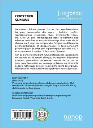 Cet ouvrage présente les différentes dimensions de l'entretien clinique tant dans ses aspects techniques que théoriques. Il met en perspective les différents modèles (psychanalytique, phénoménologique, systémique ou cognitif), et analyse les différents domaines dans lesquels il est utilisé (consultation médicale, entretien avec un psychologue clinicien, entretien en institution médico-sociale). Il montre enfin qu'il peut avoir plusieurs objectifs : une visée diagnostique, une visée de recherche ou encore une visée thérapeutique.