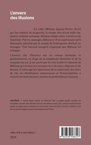 En 1983, Mélissa épouse Pierre. Porté par les valeurs de la gauche, le couple rêve d’une belle vie. Quatre enfants naissent. Mélissa jongle entre travail et vie familiale. Pierre, manager, défenseur d’un capitalisme qu’il dénonçait, absorbé par le monde de l’entreprise, devient un étranger. Tout bascule lorsqu’il s’aperçoit que Mélissa lui échappe. L’envers des illusions est un roman intimiste et générationnel, un éloge de la complexité féminine et de la conquête de soi. Il est porté par la voix lucide et vibrante de Mélissa qui revient sur son parcours de mère, d’épouse et de femme. Il interroge les injonctions de la maternité, les choix de vie, les désillusions amoureuses et l’émancipation, à travers un récit incarné, sincère et profondément humain.