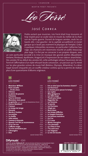 Une biographie de Léo Ferré, écrite par Martin Pénet, illustrée par José Correa, accompagnée de 2 compact discs.<br /> Poète autant que musicien, Léo Ferré était trop insoumis et trop inspiré pour se couler dans le moule du métier de la chanson de l'après-guerre. Durant de longues années, seuls les cabarets dits "rive gauche" de la capitale accueillirent ce monégasque qui n'avait pas vraiment le physique de l'emploi. Grâce à quelques interprètes reconnus, en particulier Catherine Sauvage, ses chansons ont néanmoins touché un public beaucoup plus large.<br /> Cette anthologie retrace l'ascension de Léo Ferré au cours des années 50 et l'affirmation d'un style refusant toute concession : un parcours qui l'a finalement mené sur les plus grandes scènes de music-hall.<br /> A poet and a musician in equal parts, Léo Ferré was too much of an inspired rebel to fit into the mould demanded of budding post-war songwriters in Paris. For many long years, only the nightclubs on the Left Bank opened their doors to this Monaco citizen with none of the looks of the others who appeared there. But thanks to a few singers of renown, and Catherine Sauvage in particular, the songs of Ferré would touch a much vaster audience. <br /> This anthology retraces Ferré's ascent from the Fifties to the early Sixties. His style made no concessions, yet he performed on the stages of the greatest music halls, including Bobino, the Olympia and the Alhambra. In the course of some fifty years, Ferré developed a continuous, creative pulse that made him an essential part of late 20th century culture.<br /> CD 1 LEO FERRE (1953-1961)<br /><br /> 1. Monsieur William (Jean-Roger Caussimon, Léo Ferré) 3’40<br /> 2. Paris Canaille (Léo Ferré) 3’20<br /> 3. ... Et des clous (Léo Ferré) 2’18<br /> 4. Vitrines (Léo Ferré) 4’31<br /> 5. Le piano du pauvre (Léo Ferré) 3’10<br /> 6. L'homme (Léo Ferré) 2’45<br /> 7. Vise la réclame (Léo Ferré) 2’56<br /> 8. Monsieur mon passé (Léo Ferré) 3’22<br /> 9. Le guinche (Léo Ferré) 2’47<br /> 10. Pauvre Rutebeuf (Rutebeuf, Léo Ferré) 3’22<br /> 11. L'amour (Léo Ferré) 2’15<br /> 12. Le temps du tango (Jean Roger Caussimon, Léo Ferré) 3’49<br /> 13. Paname (Léo Ferré) 4’33<br /> 14. Merde à Vauban (Pierre Seghers, Léo Ferré) 3’11<br /> 15. Les poètes (Léo Ferré) 2’49<br /> 16. La mafia (Léo Ferré) 2’50<br /> 17. Jolie môme (Léo Ferré) 2’38<br /> 18. Comme à Ostende (Jean Roger Caussimon, Léo Ferré) 3’35<br /> 19. Quand c’est fini ça recommence (René Rouzeaud, Léo Ferré) 2’17<br /> 20. Si tu t’en vas (Léo Ferré) 4’04<br /> 21. L’affiche rouge (Louis Aragon, Léo Ferré) 4’02<br /> 22. Tu n’en reviendras pas (Louis Aragon, Léo Ferré) 2’54<br /> 23. L’étrangère (Louis Aragon, Léo Ferré) 3’53<br /> 24. Elsa (Louis Aragon, Léo Ferré) 2’42<br /> Durée Totale CD 1 : 78’41<br /><br /> CD 2 LEO FERRE (1961 – 1962)<br /><br /> 1. Est-ce ainsi que les hommes vivent ? (Louis Aragon, Léo Ferré) 3’31<br /> 2. Les fourreurs (Louis Aragon, Léo Ferré) 2’36<br /> 3. Je chante pour passer le temps (Louis Aragon, Léo Ferré) 2’50<br /> 4. Les rupins (Léo Ferré) 3’06<br /> 5. Miss guéguerre (Léo Ferré) 3’38<br /> 6. Les quat’ cents coups (Léo Ferré) 4’19<br /> 7. Thank you Satan (Léo Ferré) 4’49<br /> 8. Regardez-les (Francis Claude, Léo Ferré) 2’43<br /> 9. Les femmes (Léo Ferré) 2’40<br /> 10. Ta parole (Léo Ferré) 2’55<br /> 11. Les parisiens (Léo Ferré) 2’47<br /> 12. Vingt ans (Léo Ferré) 2’29<br /> 13. Nous deux (Léo Ferré) 4’04<br /> 14. Les temps difficiles (Léo Ferré) 3’43<br /> 15. La langue française (Léo Ferré) 3’35<br /> 16. Les bonnes manières (Léo Ferré) 3’32<br /> 17. Ça t’va (Léo Ferré) 3’01<br /> 18. E. P. Love (Léo Ferré) 3’26<br /> 19. Mister Georgina (Léo Ferré) 3’57<br /> 20. T’es chouette (Léo Ferré) 2’21<br /> 21. Ça s’lève à l’est (Léo Ferré) 3’25<br /> 22. T’es rock coco (Léo Ferré) 2’50<br /> 23. Les Tziganes (Léo Ferré) 3’03<br /> 24. La vie est louche (Léo Ferré) 2’54<br /><br /> Durée totale cd 2 : 79’13<br />
