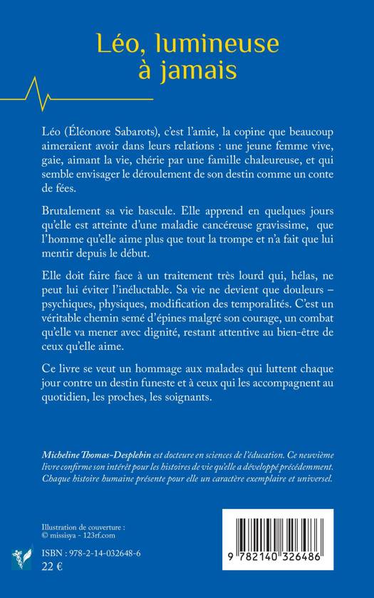 Léo (Éléonore Sabarots), c'est l'amie, la copine que beaucoup aimeraient avoir dans leurs relations: une jeune femme vive, gaie, aimant la vie, chérie par une famille chaleureuse, et qui semble envisager le déroulement de son destin comme un conte de fées. Brutalement sa vie bascule. Elle apprend en quelques jours qu'elle est atteinte d'une maladie cancéreuse gravissime, que l'homme qu'elle aime plus que tout la trompe et n'a fait que lui mentir depuis le début. Elle doit faire face à un traitement très lourd qui, hélas, ne peut lui éviter l'inéluctable. Sa vie ne devient que douleurs - psychiques, physiques, modification des temporalités. C'est un véritable chemin semé d'épines malgré son courage, un combat qu'elle va mener avec dignité, restant attentive au bien-être de ceux qu'elle aime. Ce livre se veut un hommage aux malades qui luttent chaque jour contre un destin funeste et à ceux qui les accompagnent au quotidien, les proches, les soignants.