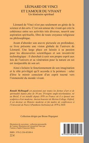 Léonard de Vinci n'est pas seulement un génie de la science et des arts. C'est son amour du vivant qui crée la cohérence entre ses activités très diverses, nourrit une aspiration spirituelle, libre de toute croyance religieuse ou philosophique. Avant d'aborder son uvre picturale en profondeur, ce livre présente une vision globale de l'univers de Léonard. Une large place est laissée à sa passion pour les découvertes scientifiques et son inventivité technologique : il cherchait à unir son propre esprit aux lois de l'univers et sa vénération pour la nature en soi est inséparable de son art. Ainsi s'éclaire le fonctionnement de son imagination et le rôle privilégié qu'il accorda à la peinture : celui d'être le miroir conscient d'un esprit tourné vers l'immensité du monde vivant.