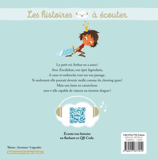 Le petit roi Arthur trouve sa nouvelle épée " Excalidure " bien lourde et encombrante. Elle ne fait que des dégâts : choux, betteraves et navets finissent en brochette à la pointe de son épée. Pire ! Son altesse pique par mégarde les fesses de ses conseillers. Plus personne n'ose s'approcher. Alors le petit roi en a assez ! Il file trouver sa marraine, une grande magicienne qui, d'un coup de baguette magique, rend l'épée molle comme du chewing-gum ! Seulement, avec une épée toute flagada difficile de combattre le dragon. La légende du roi Arthur, revisitée avec humour, à lire et à écouter.