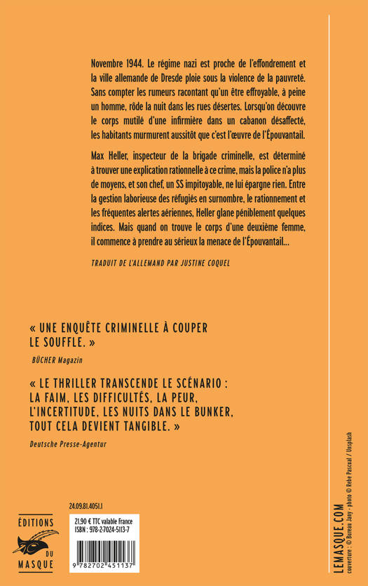 Max Heller, inspecteur de la brigade criminelle, est déterminé à trouver une explication rationnelle à ce crime, mais la police n’a plus de moyens, et son chef, un SS impitoyable, ne lui épargne rien. Entre la gestion laborieuse des réfugiés en surnombre, le rationnement et les fréquentes alertes aériennes, Heller glane péniblement quelques indices. Mais quand on trouve le corps d’une deuxième femme, il commence à prendre au sérieux la menace de l’Épouvantail…
