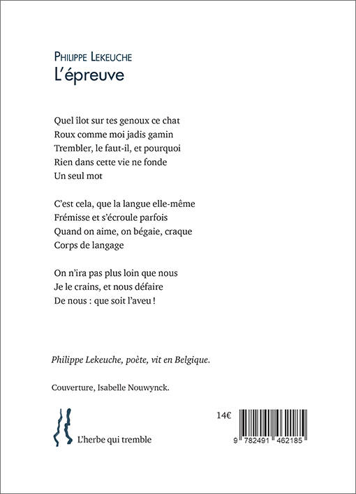 Dans son préambule, Philippe Lekeuche se penche sur le sens du travail du poète, après longtemps de poésie. « Faire » de la poésie, dit-il, est un « acte ». « Il n’y a pas de mots d’amour, il n’y a que des preuves d’amour, cela a un prix (par exemple donner sa vie), tout comme cette pratique de la poésie exige des renoncements, et même le sacrifice – je le souligne –, la question restant ouverte : le sacrifice de quoi ? On ne le sait pas, on l’apprend avec les années, dans l’endurance. Je veux dire qu’on le vit, c’est une épreuve. Et quant à la réponse de savoir si cela en vaut la peine, elle fait toujours défaut. Et qu’importe ! On n’a guère besoin d’elle. » Avec des peintures d'Isabelle Nouwynck.