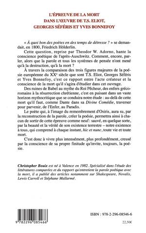 "A quoi bon des poètes en des temps de détresse ?" se demandait, en 1800, Friedrich Hölderlin. Cette question, reprise par Theodor W. Adorno, hante la conscience poétique de l'après-Auschwitz. Comment, encore, parler, alors que la parole et tous les systèmes de pensée n'ont mené qu'à la destruction, qu'à la mort ? A travers la comparaison des trois figures majeures de la poésie européenne du XXe siècle que sont T.S Eliot, Georges Séféris et Yves Bonnefoy, c'est ce rapport entre l'acte créateur et la conscience de la mort qu'il s'agira d'étudier dans cet ouvrage.